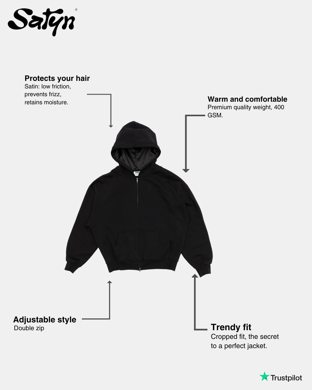 De Satinn hoodie met rits combineert comfort, stijl en haarverzorging op perfecte wijze. Dit model is ontworpen om je haar heerlijk warm te houden in de winter en het verzorgt het tegelijkertijd. De capuchon is voorzien van een satijnen voering die je haar gehydrateerd houdt en beschermt tegen pluis. Dankzij de oversized pasvorm en hoogwaardige afwerking is deze hoodie een must-have voor een moderne look en optimale bescherming.